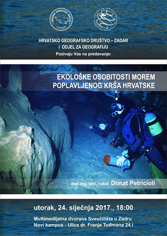 Pozivamo vas na predavanje "Ekološke osobitosti morem preplavljenog krša Hrvatske" Donata Petriciolija, dipl. ing. biolgije i ekologije, koje će se održati u utorak, 24. siječnja u 18:00 sati u multimedijalnoj dvorani Novog kampusa.